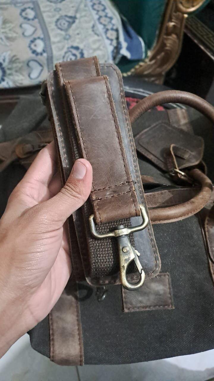 Meet your new favorite travel companion. This timeless duffel bag is built for durability and style, featuring a heavy-duty dark canvas body contrasted with rich, genuine leather trim and handles. The distressed leather accents, including the reinforced corners and end tabs, give it a rugged, vintage appeal. Spacious enough for a weekend trip, this bag is a sophisticated essential for any journey.